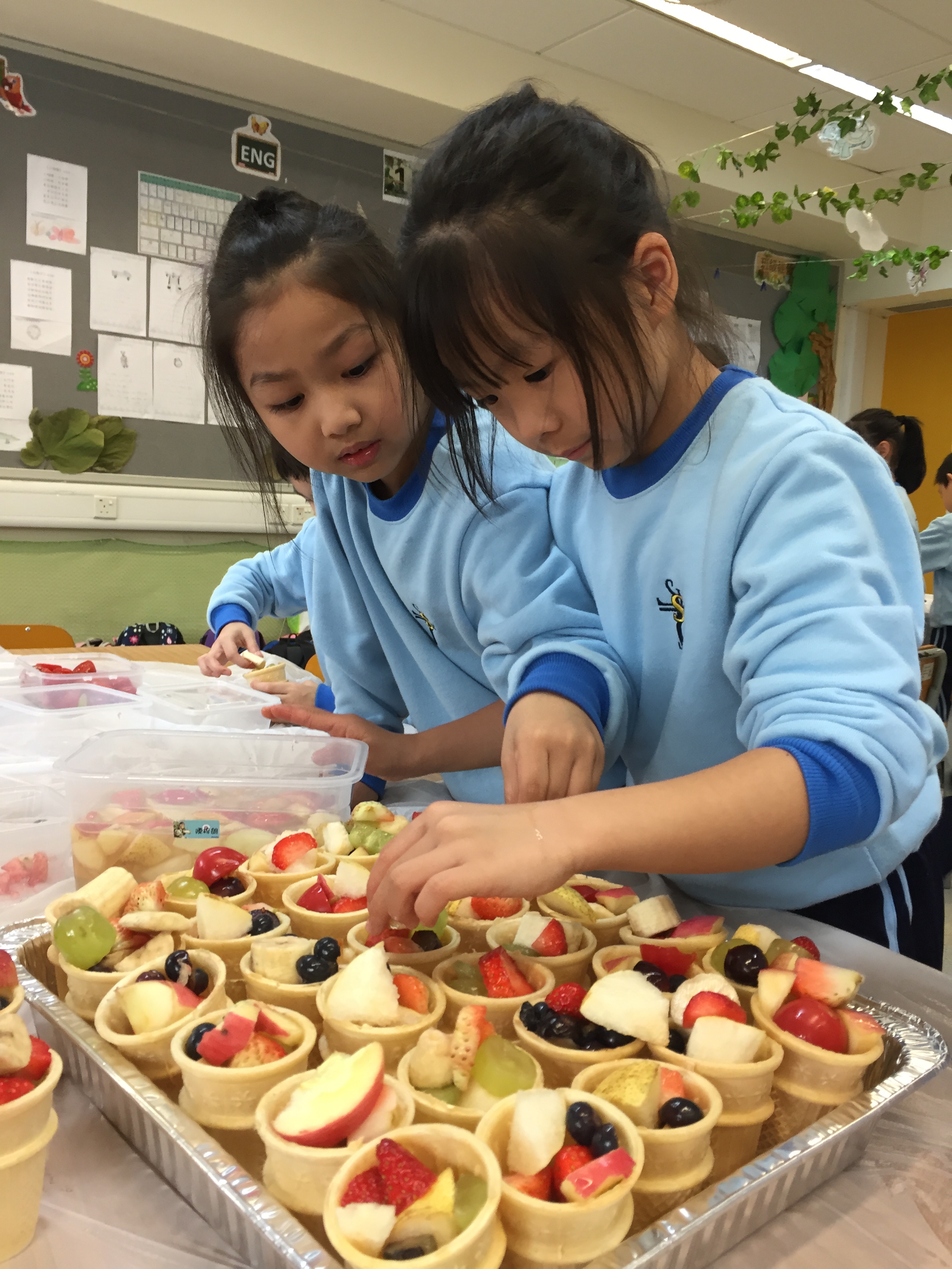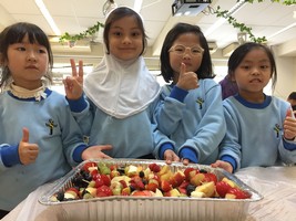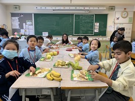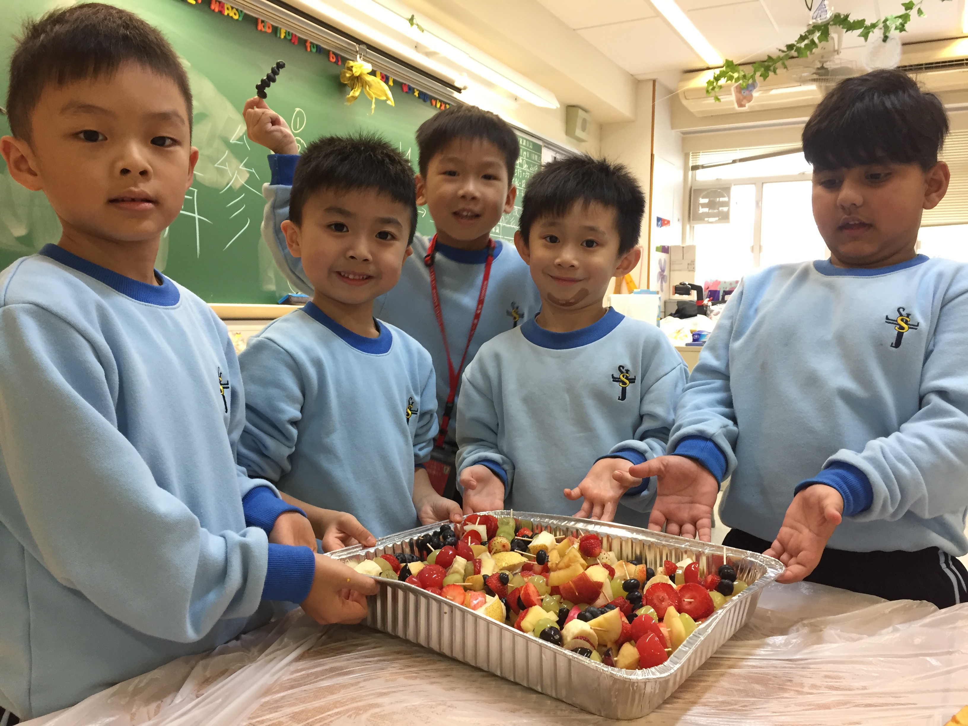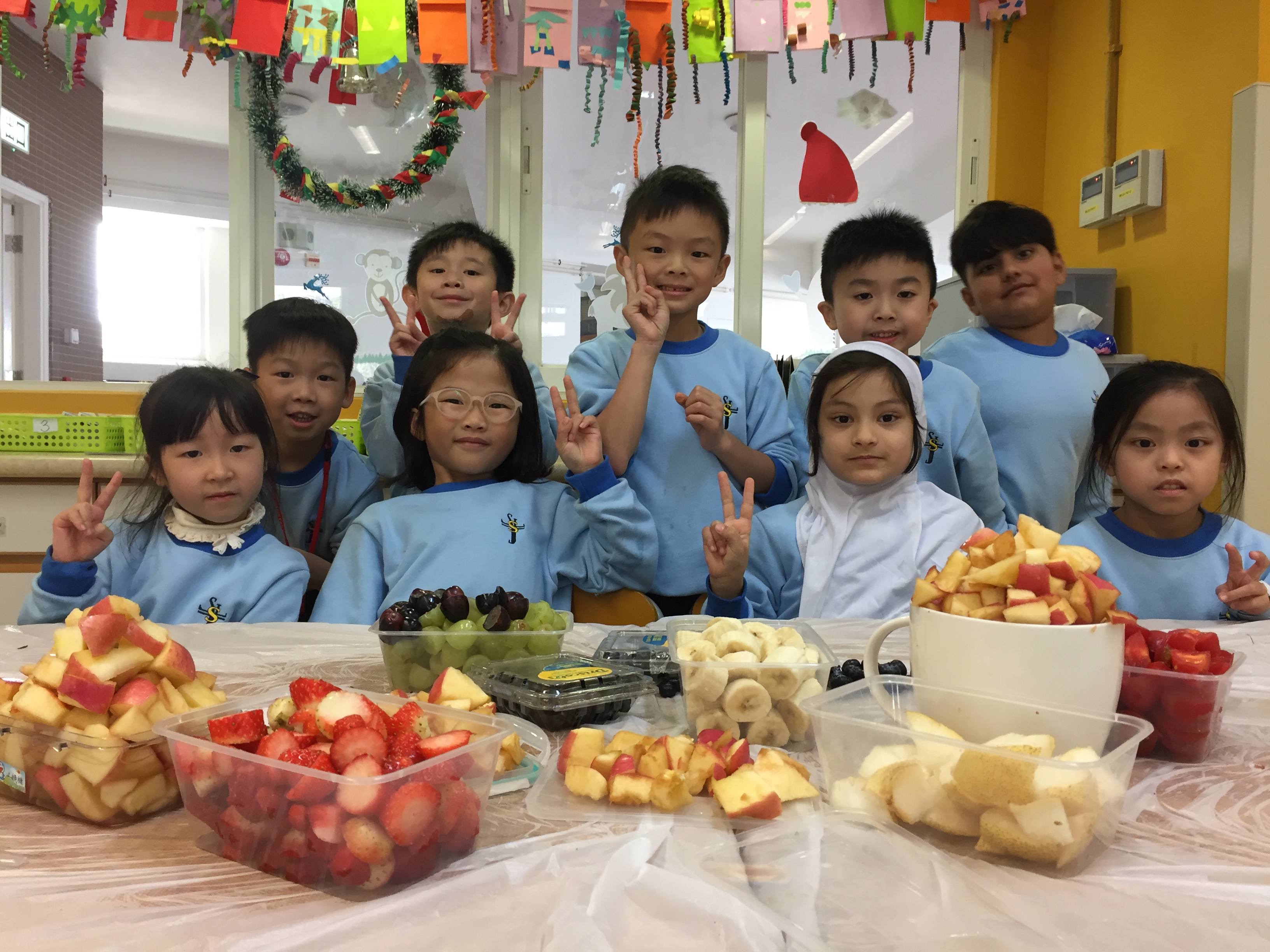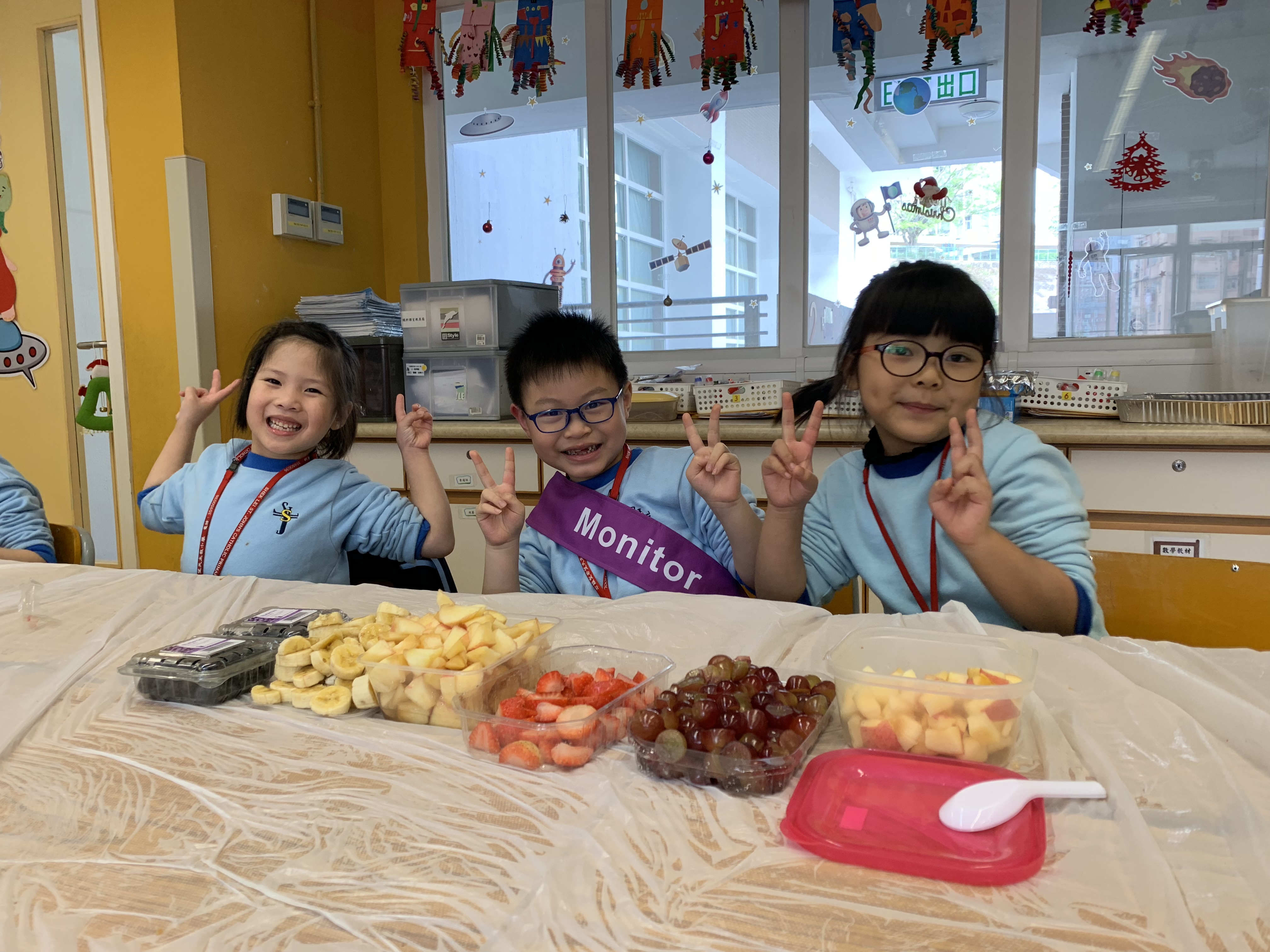 為感謝照顧他們的學校成員,小一學生帶備了水果,一起製作健康水果小食。很多小朋友都是第一次操刀,雖然開始時有點手忙腳亂,但通力合作之下終於完成精美的健康小食,送給多月來照顧大家的學校成員,一起分享努力的成果!