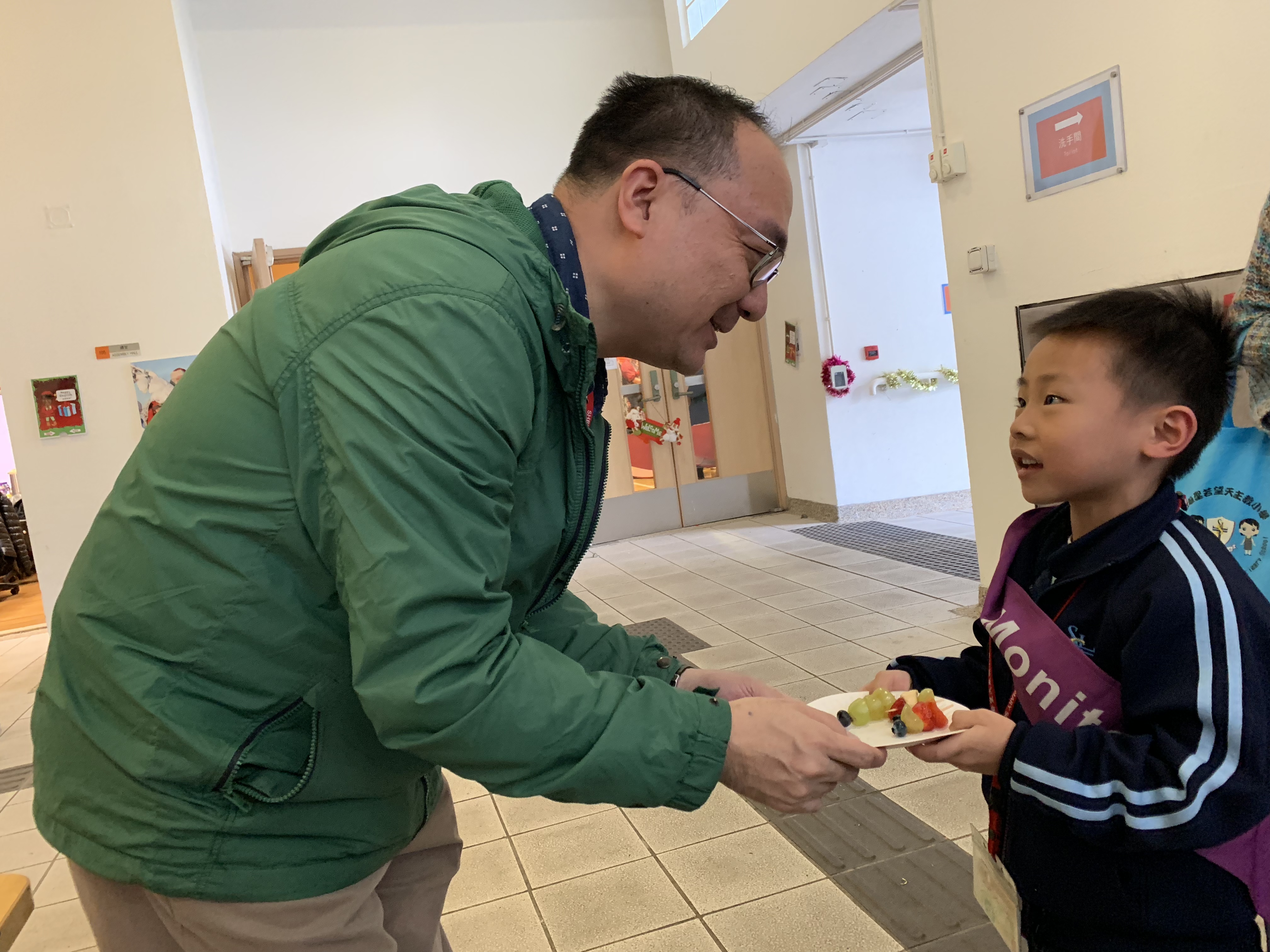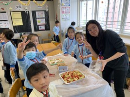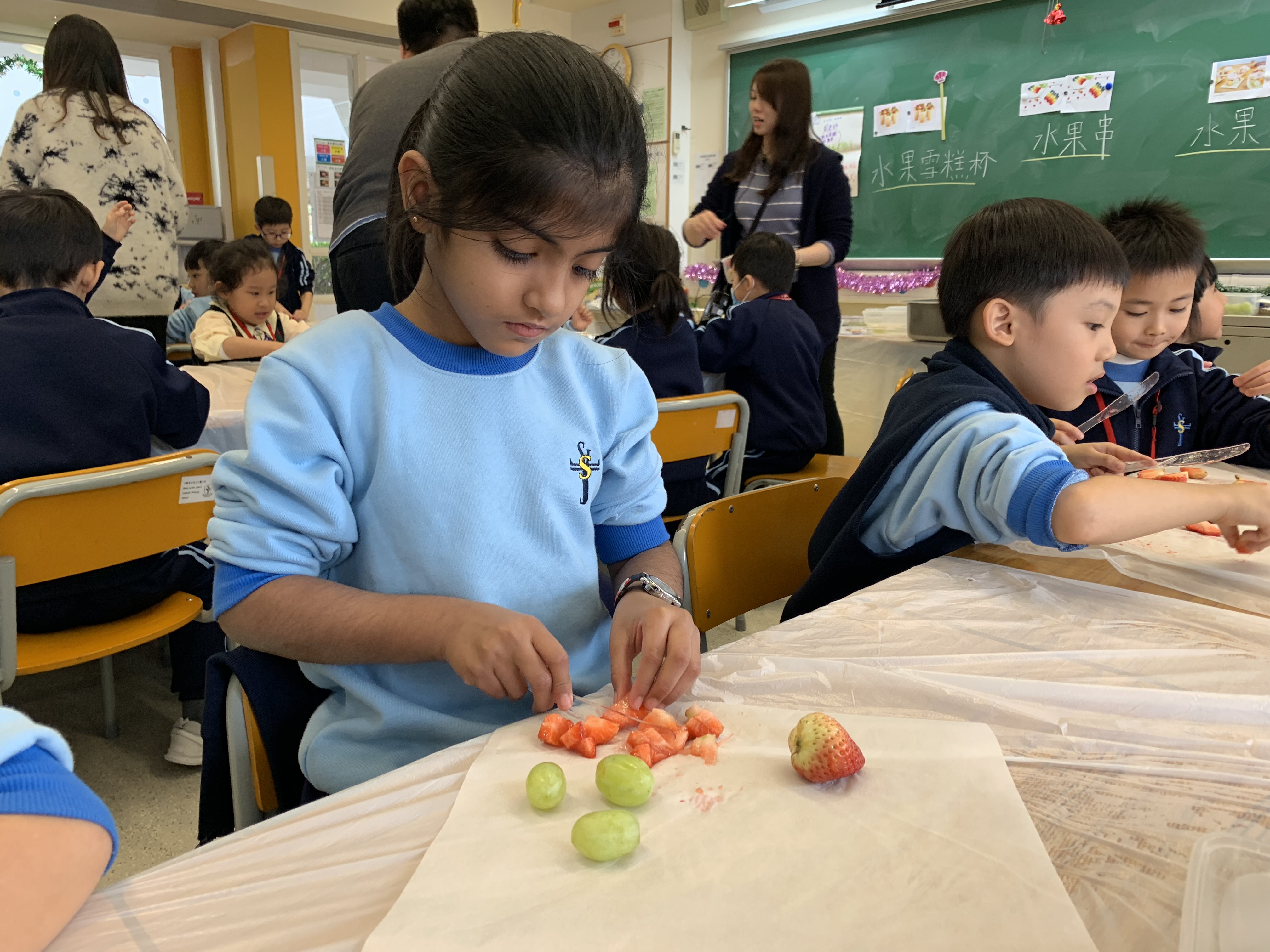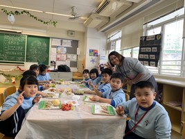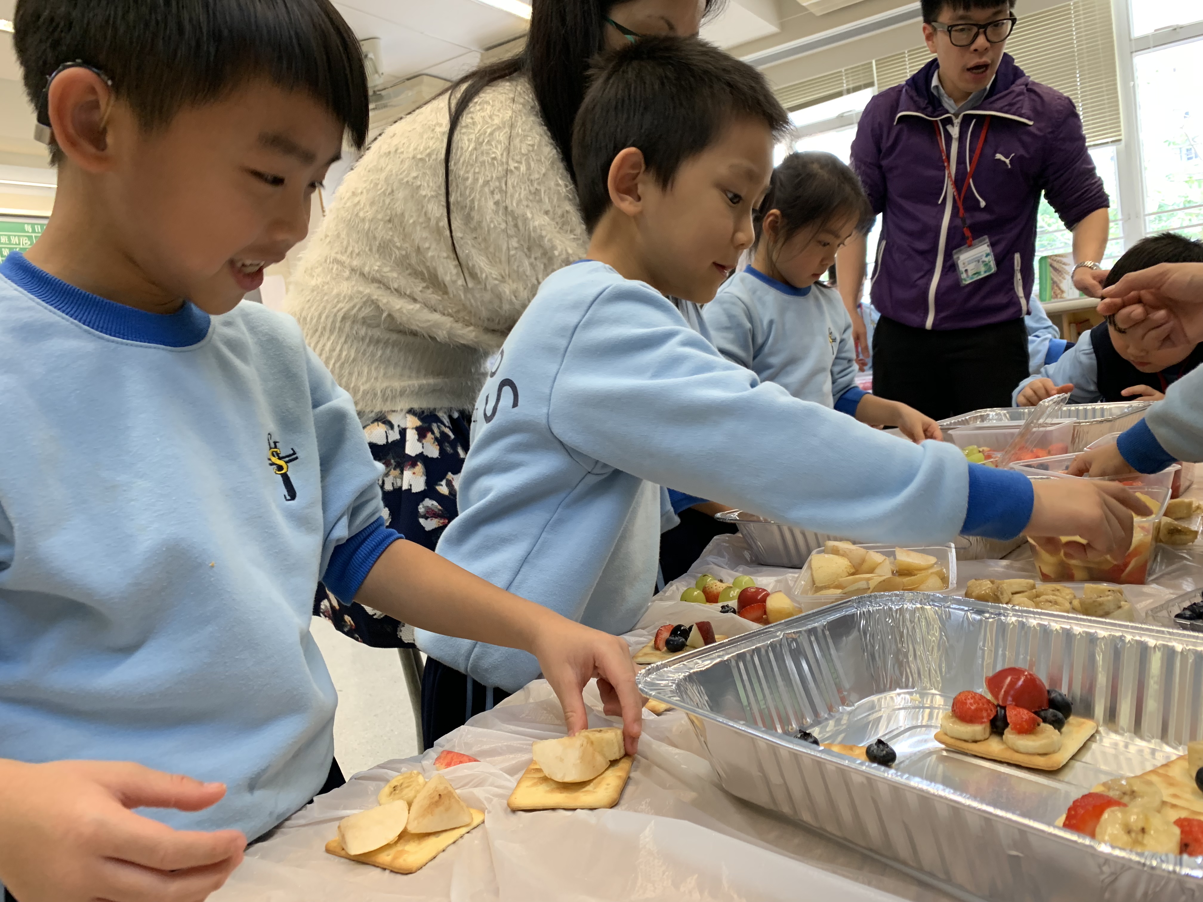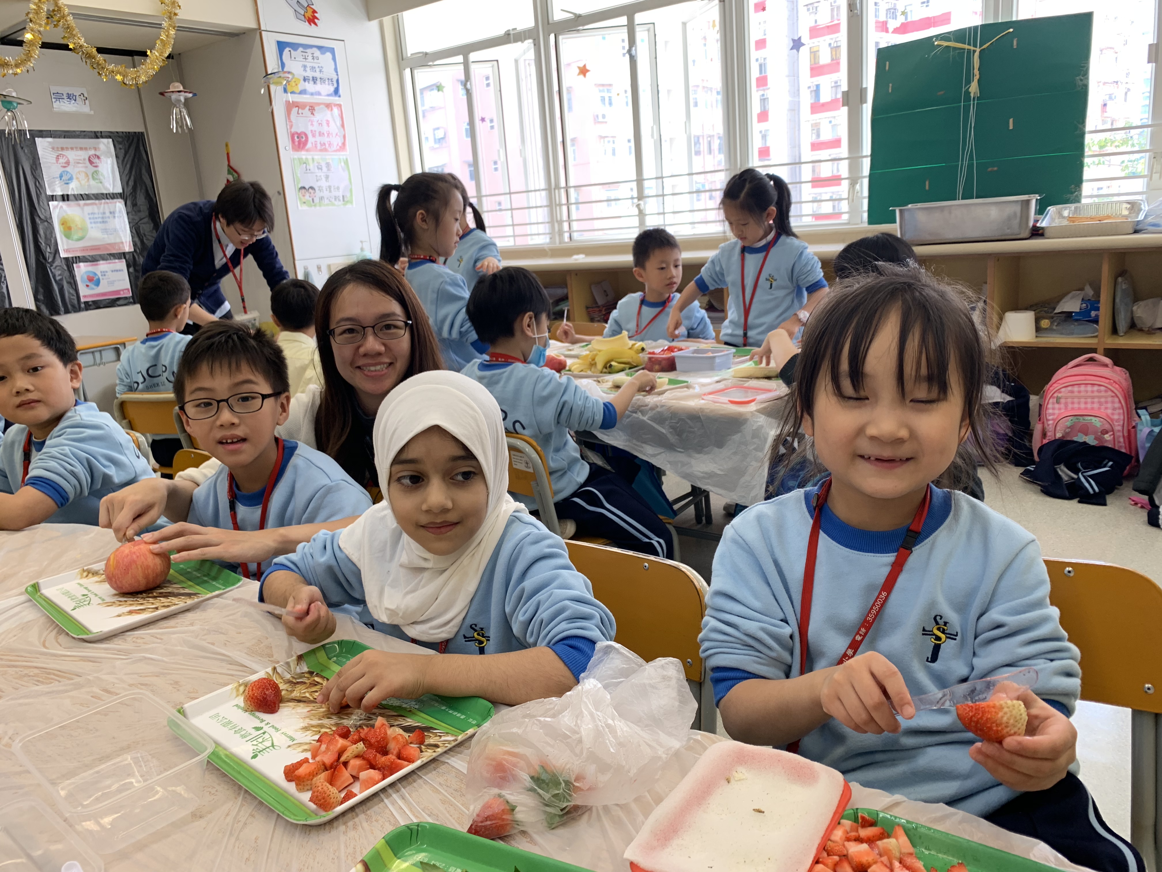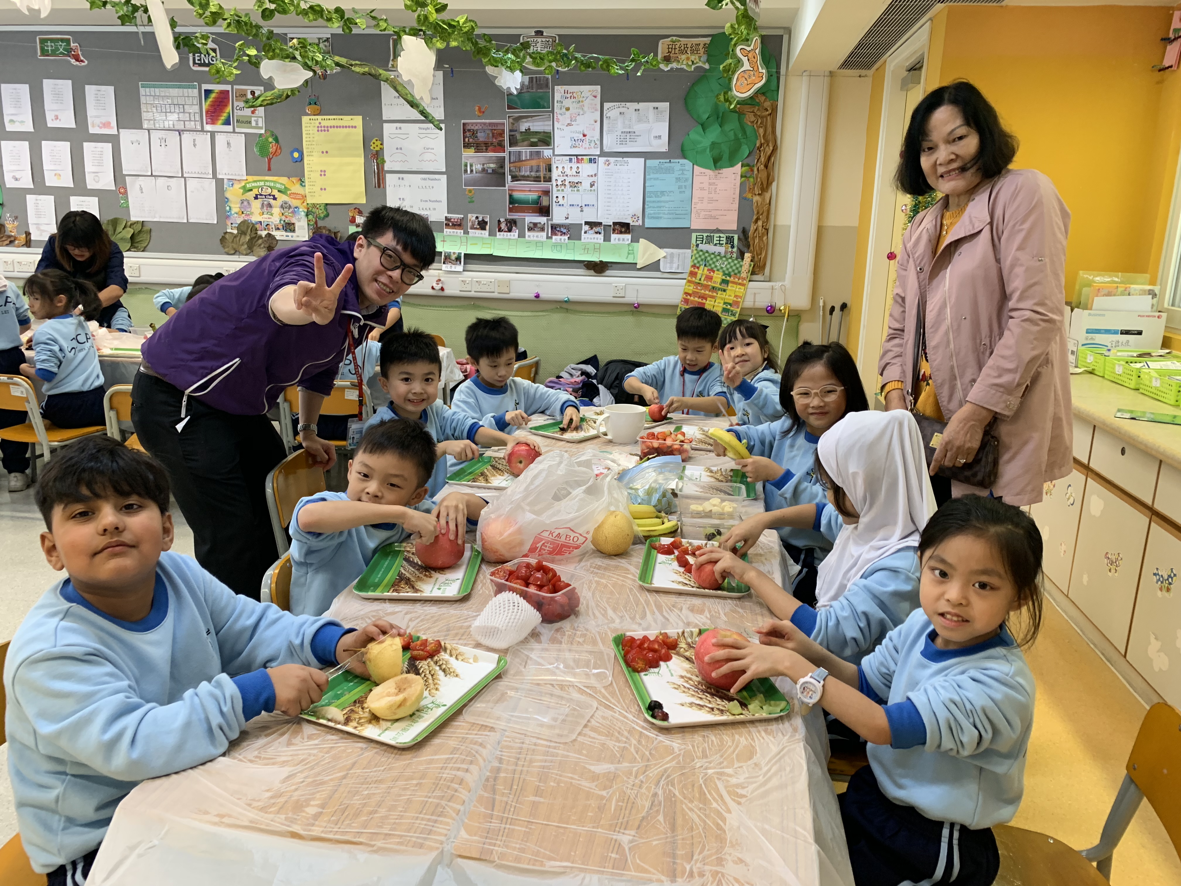 為感謝照顧他們的學校成員,小一學生帶備了水果,一起製作健康水果小食。很多小朋友都是第一次操刀,雖然開始時有點手忙腳亂,但通力合作之下終於完成精美的健康小食,送給多月來照顧大家的學校成員,一起分享努力的成果!
