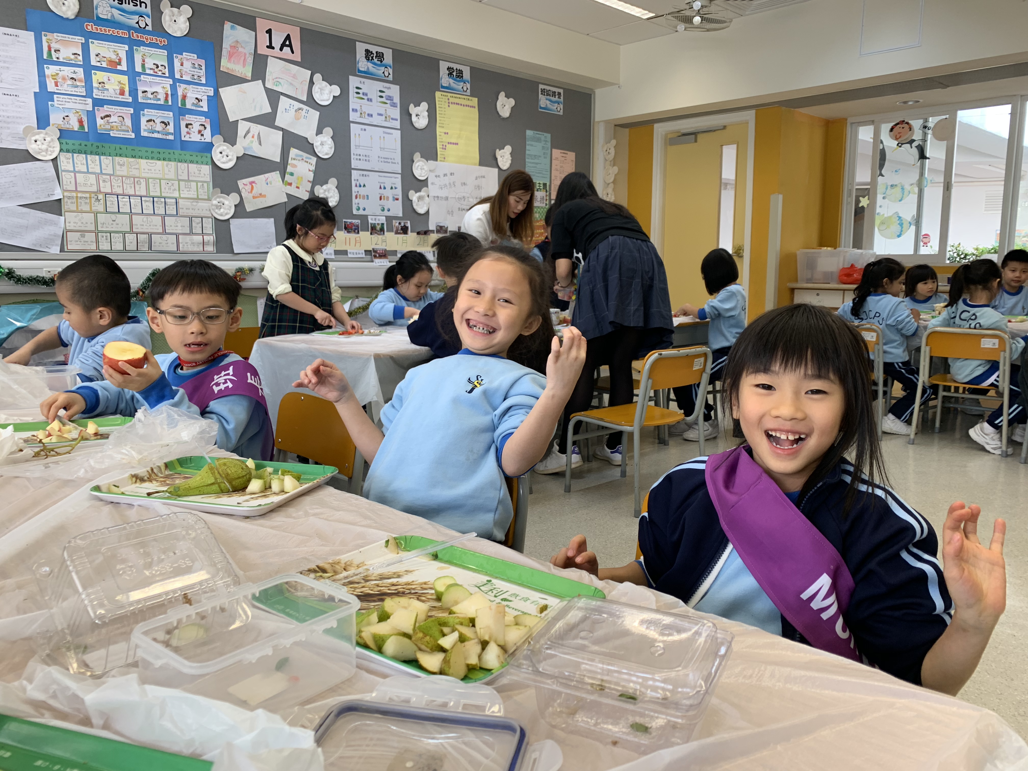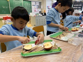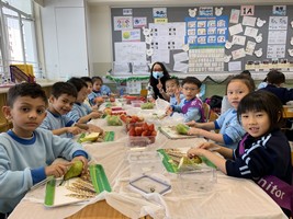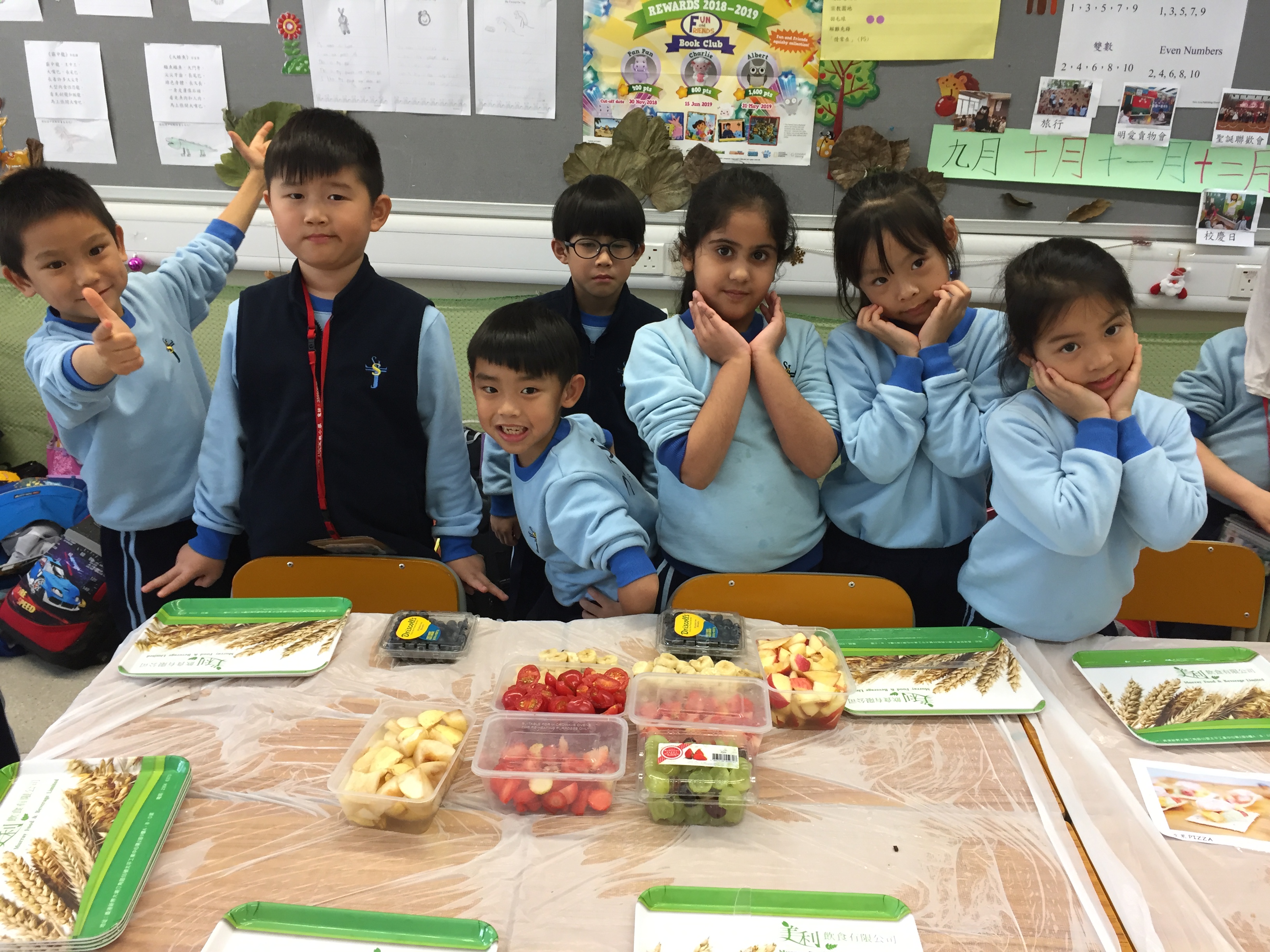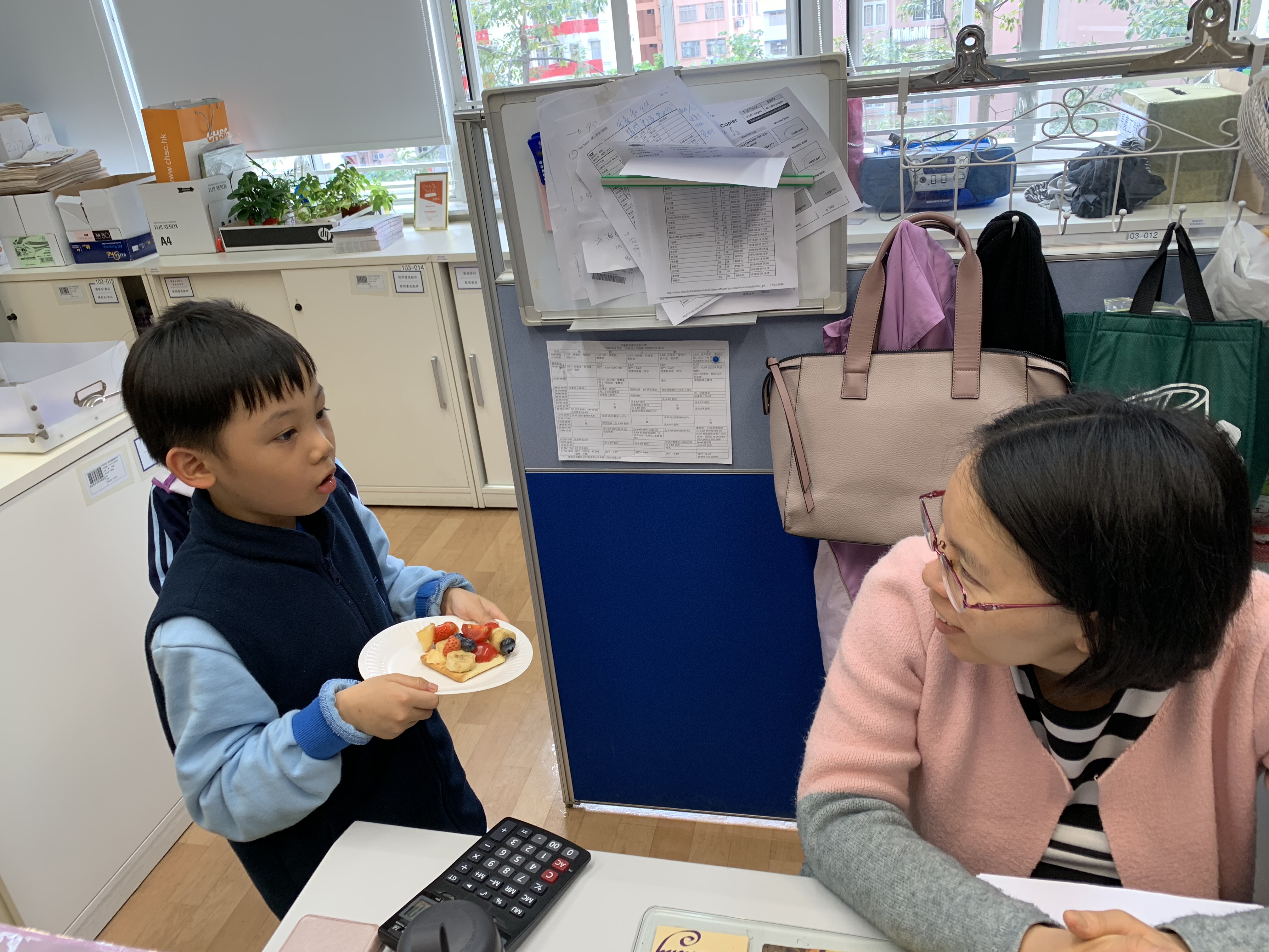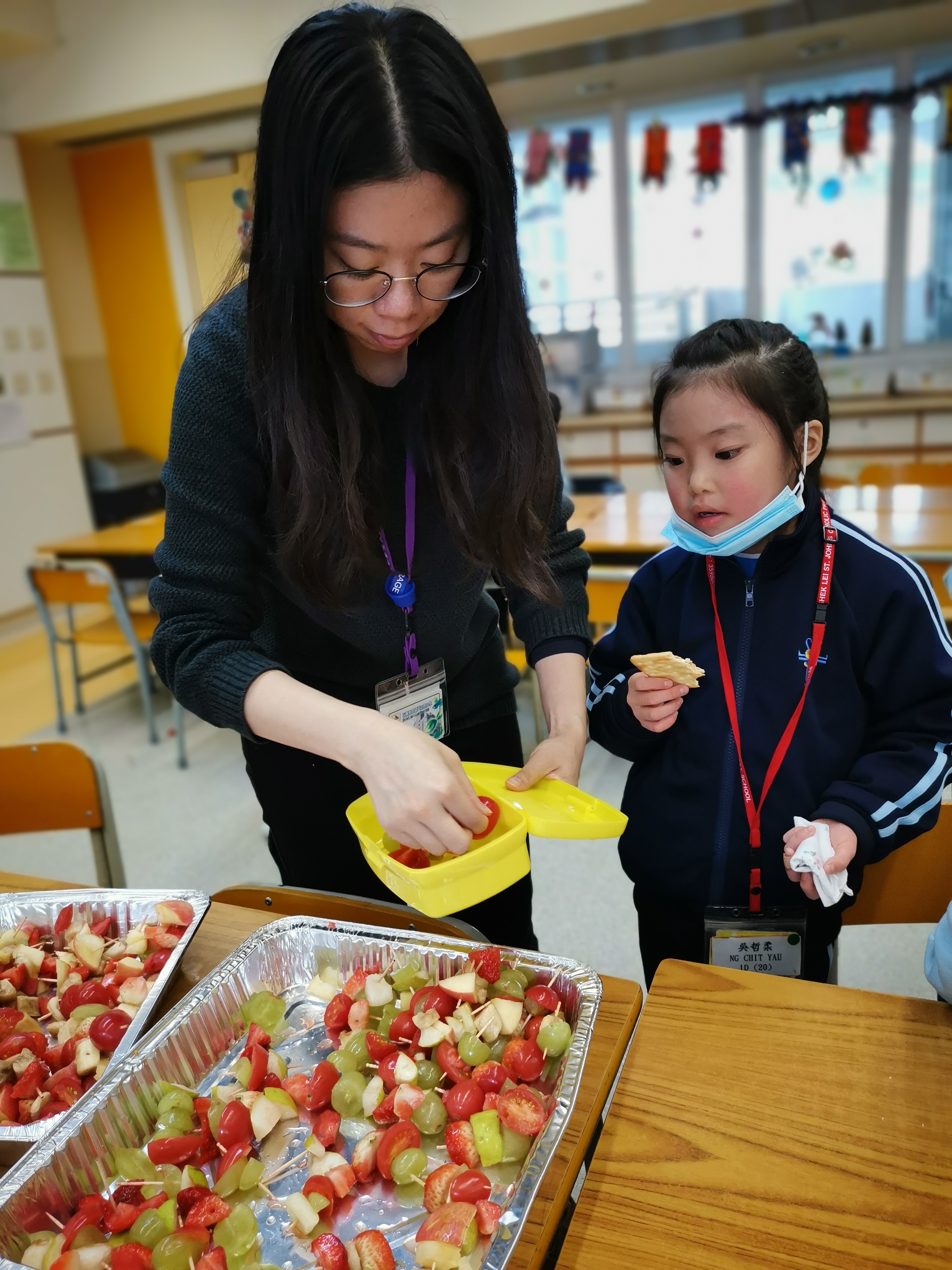 為感謝照顧他們的學校成員,小一學生帶備了水果,一起製作健康水果小食。很多小朋友都是第一次操刀,雖然開始時有點手忙腳亂,但通力合作之下終於完成精美的健康小食,送給多月來照顧大家的學校成員,一起分享努力的成果!
