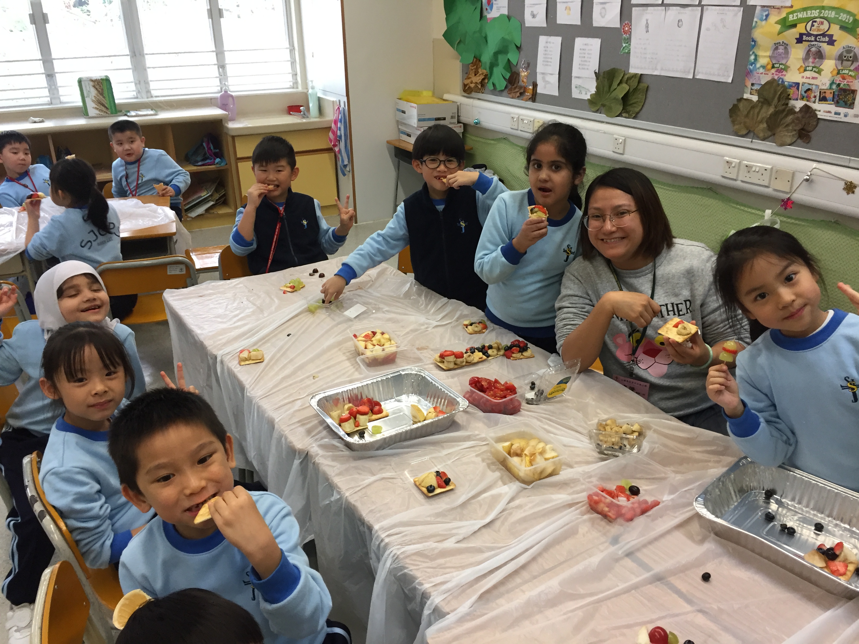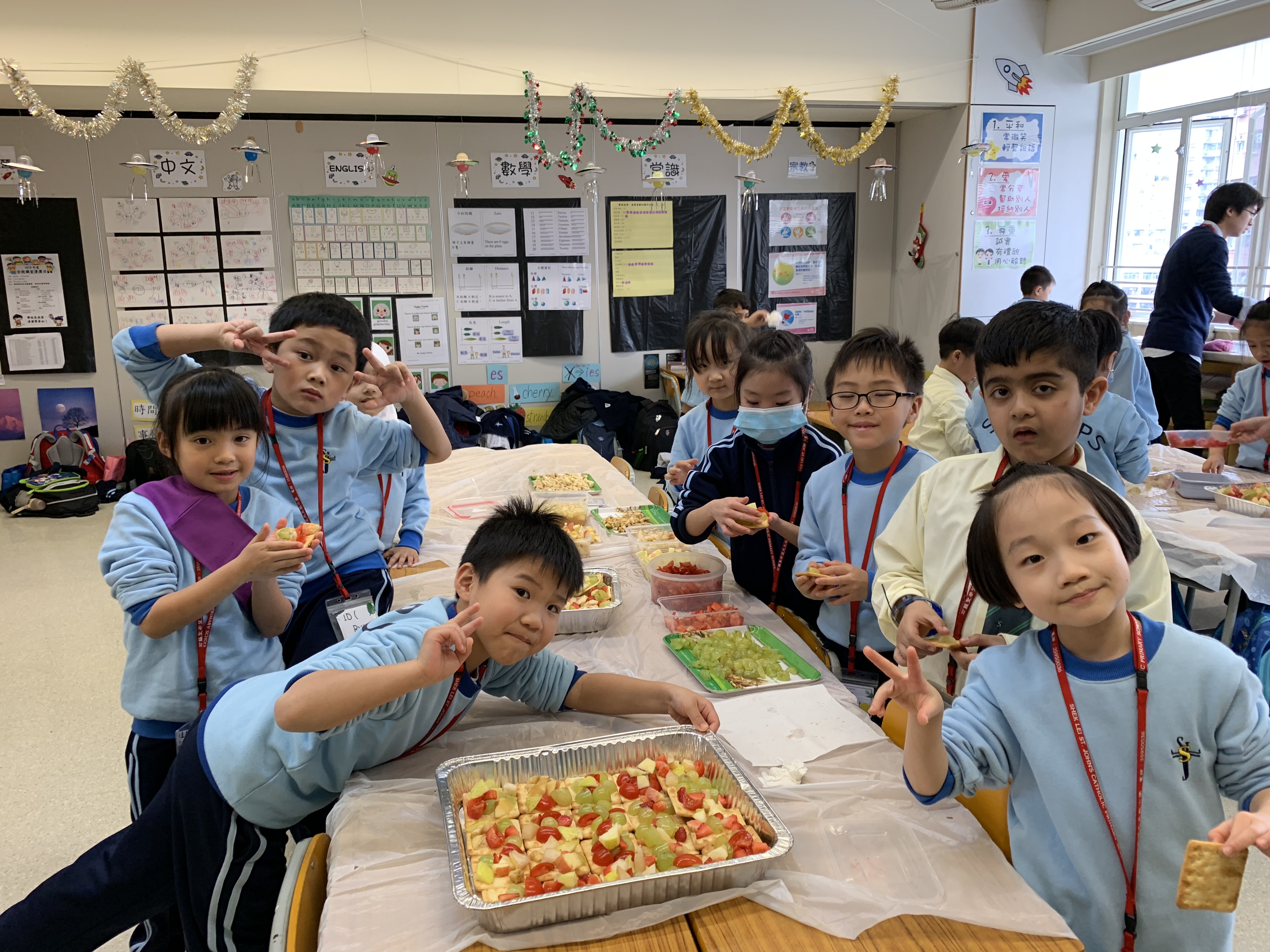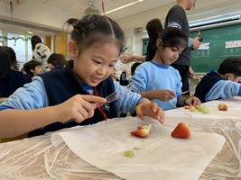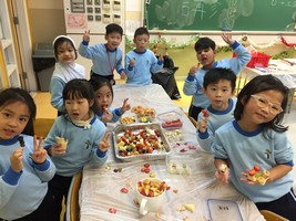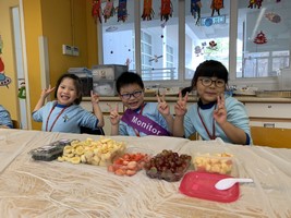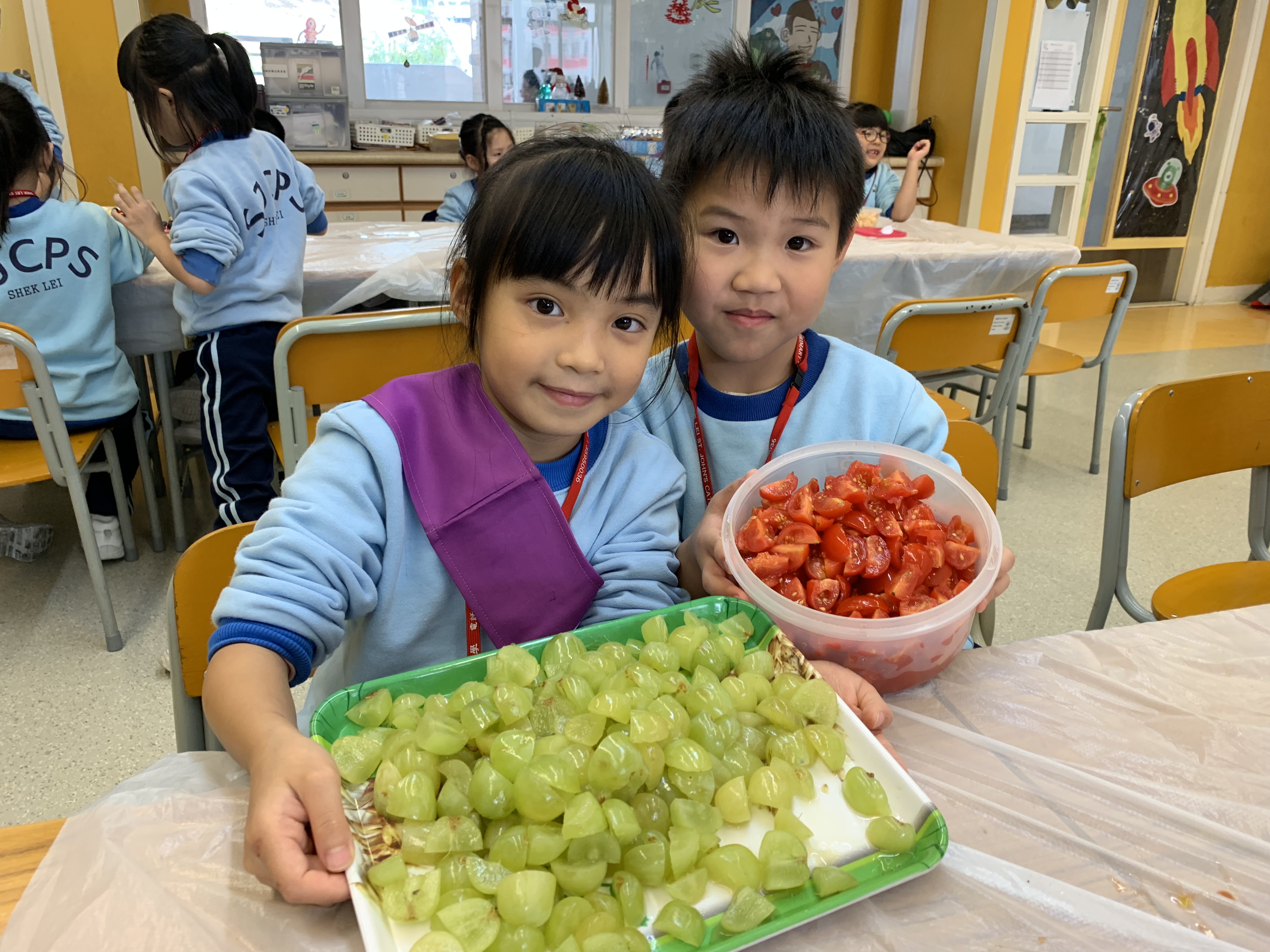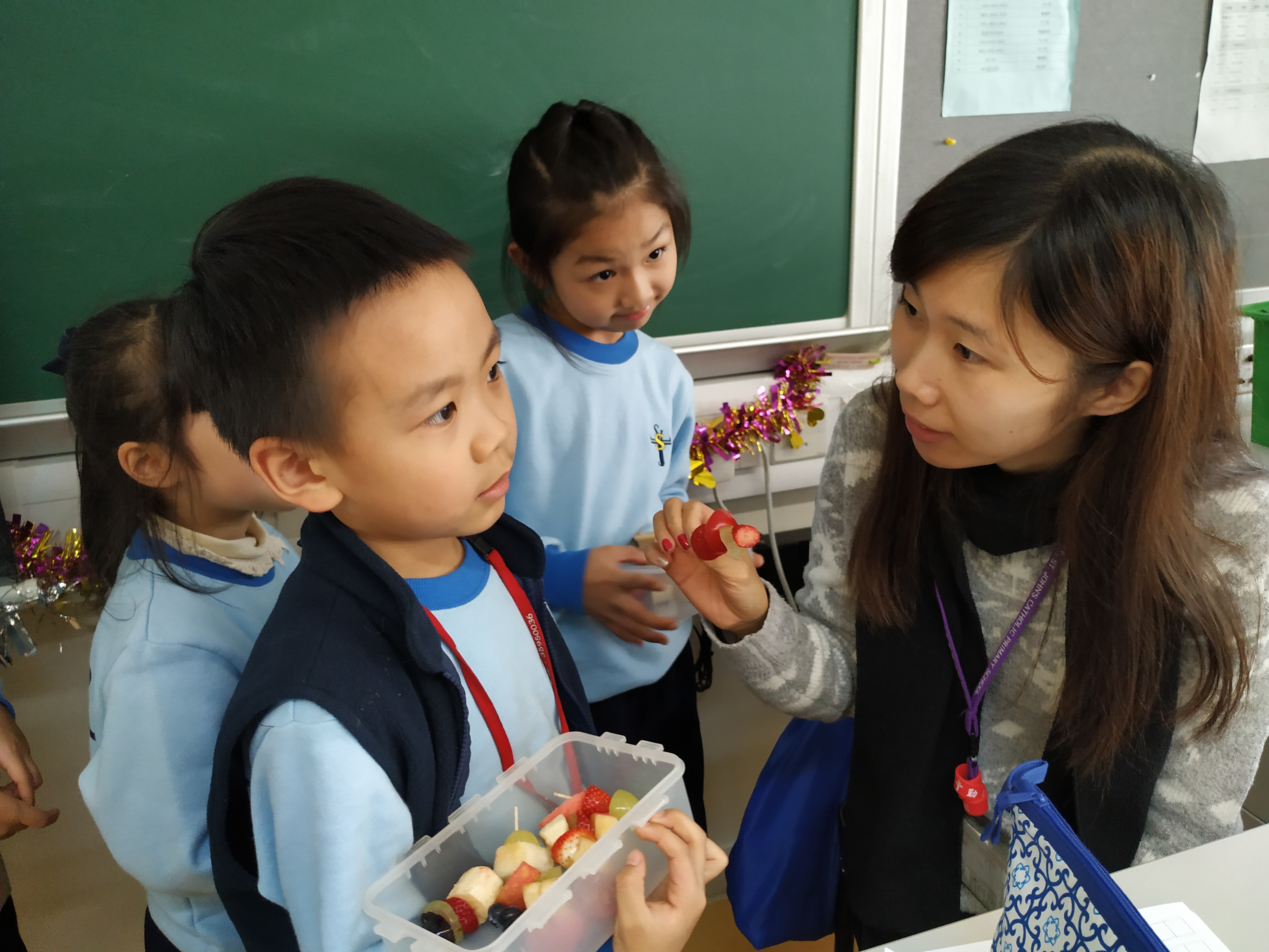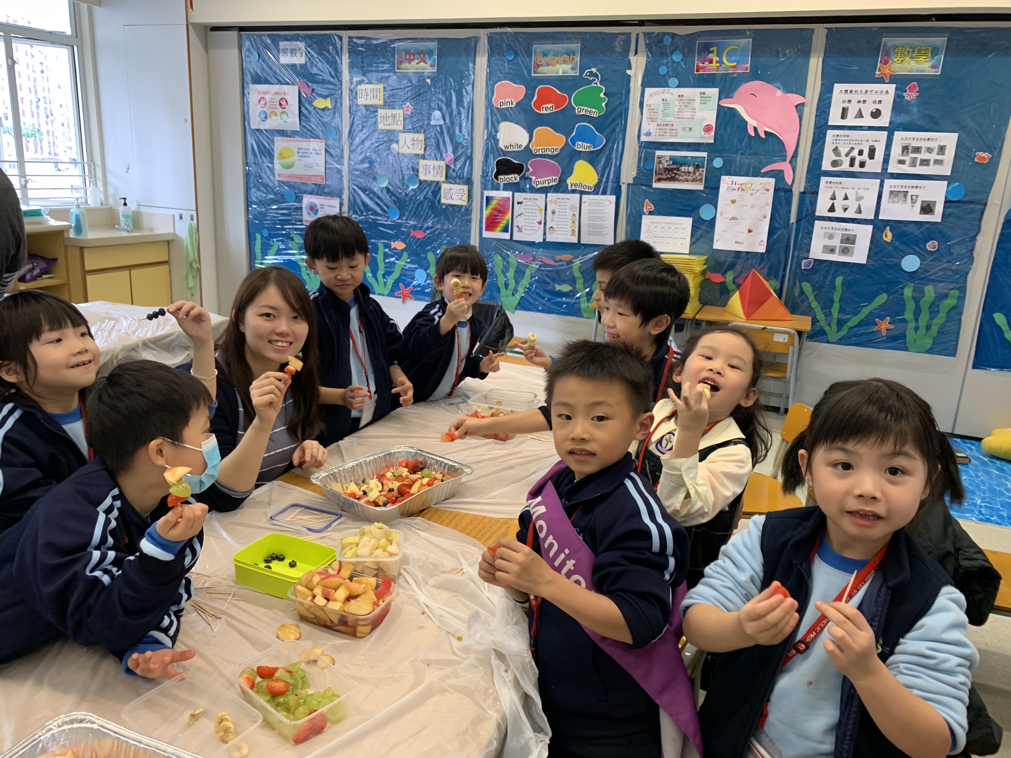 為感謝照顧他們的學校成員,小一學生帶備了水果,一起製作健康水果小食。很多小朋友都是第一次操刀,雖然開始時有點手忙腳亂,但通力合作之下終於完成精美的健康小食,送給多月來照顧大家的學校成員,一起分享努力的成果!