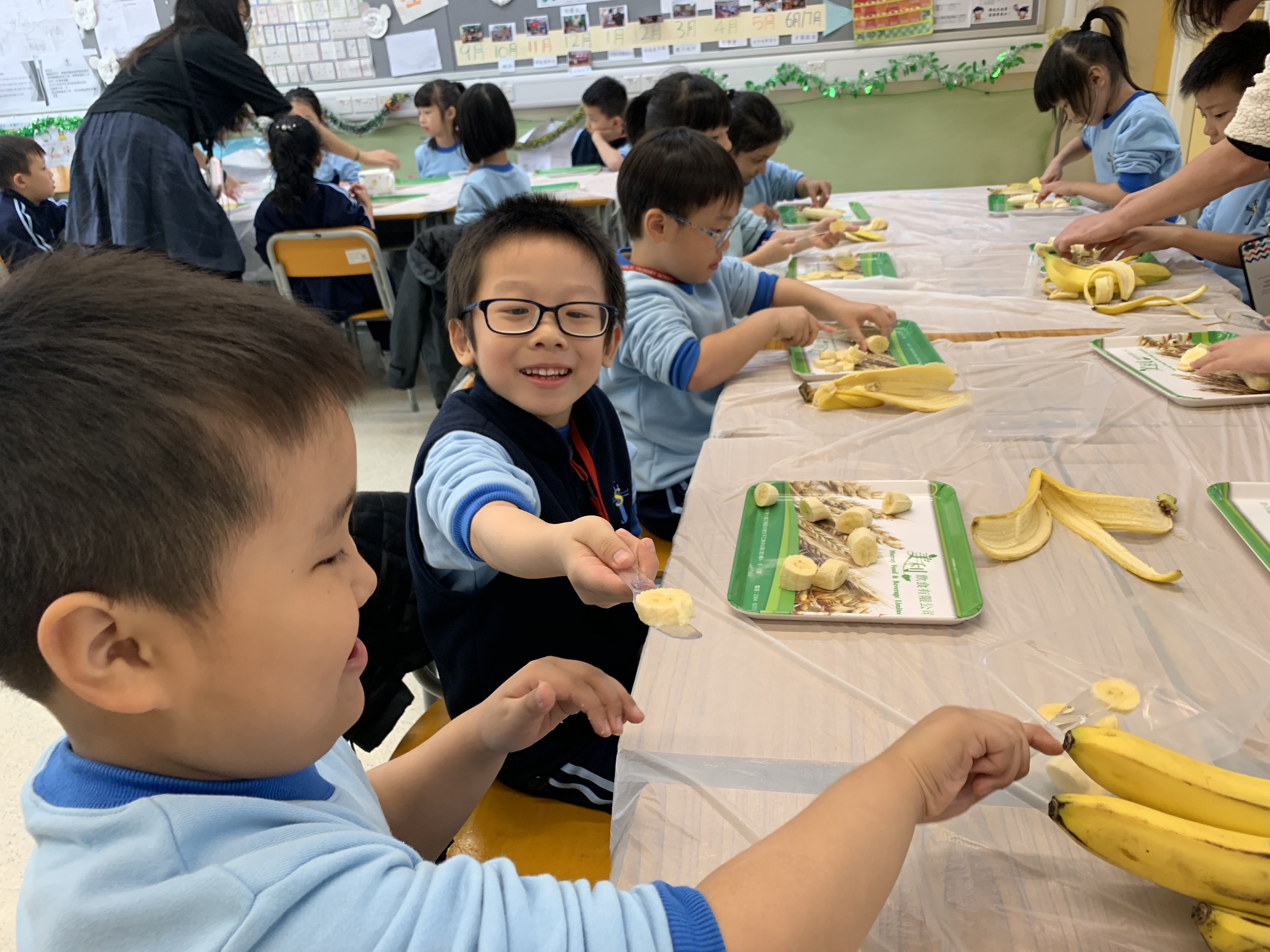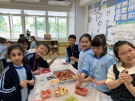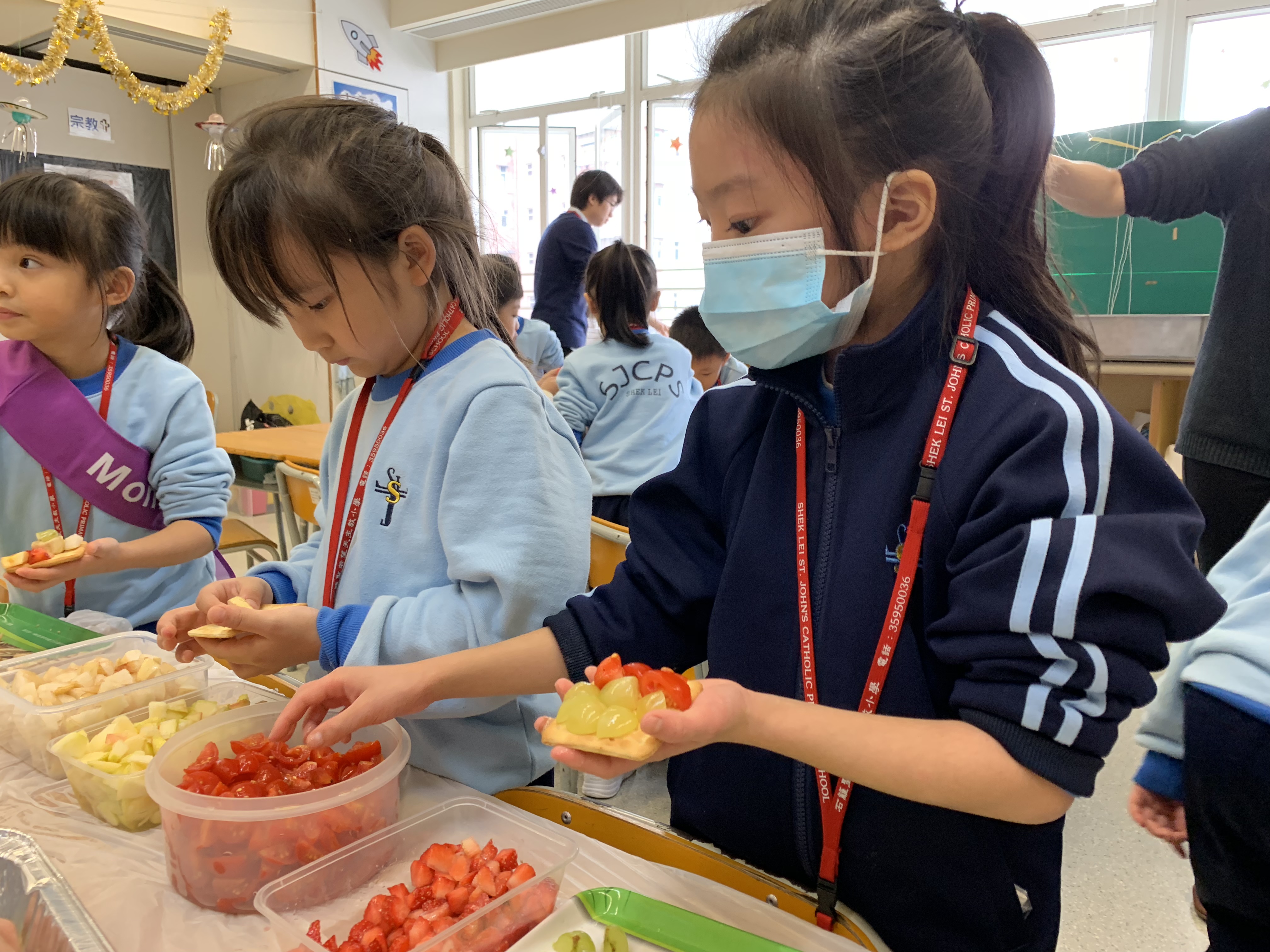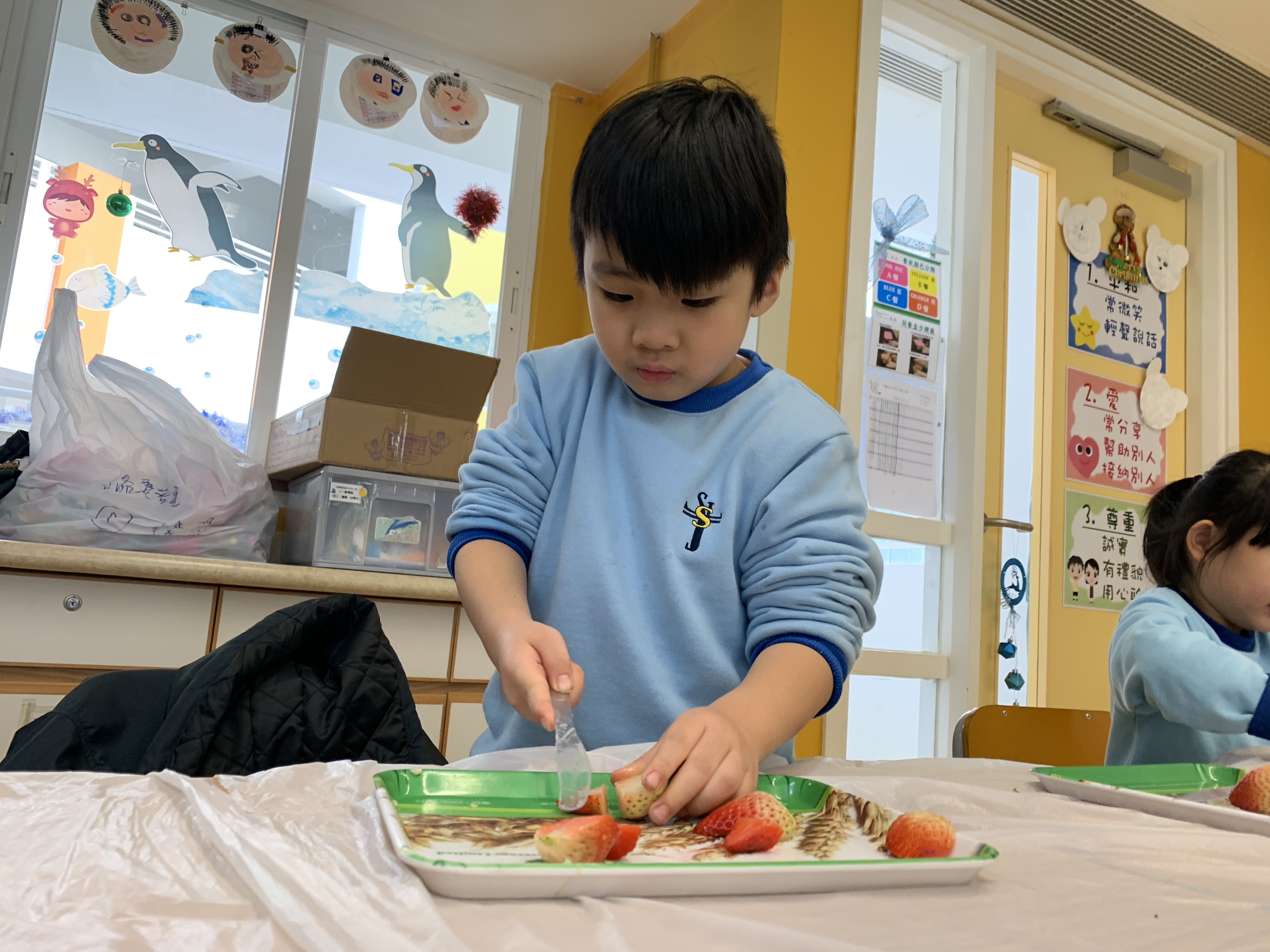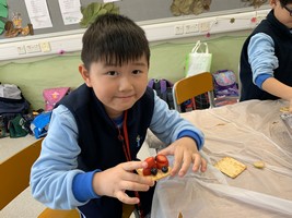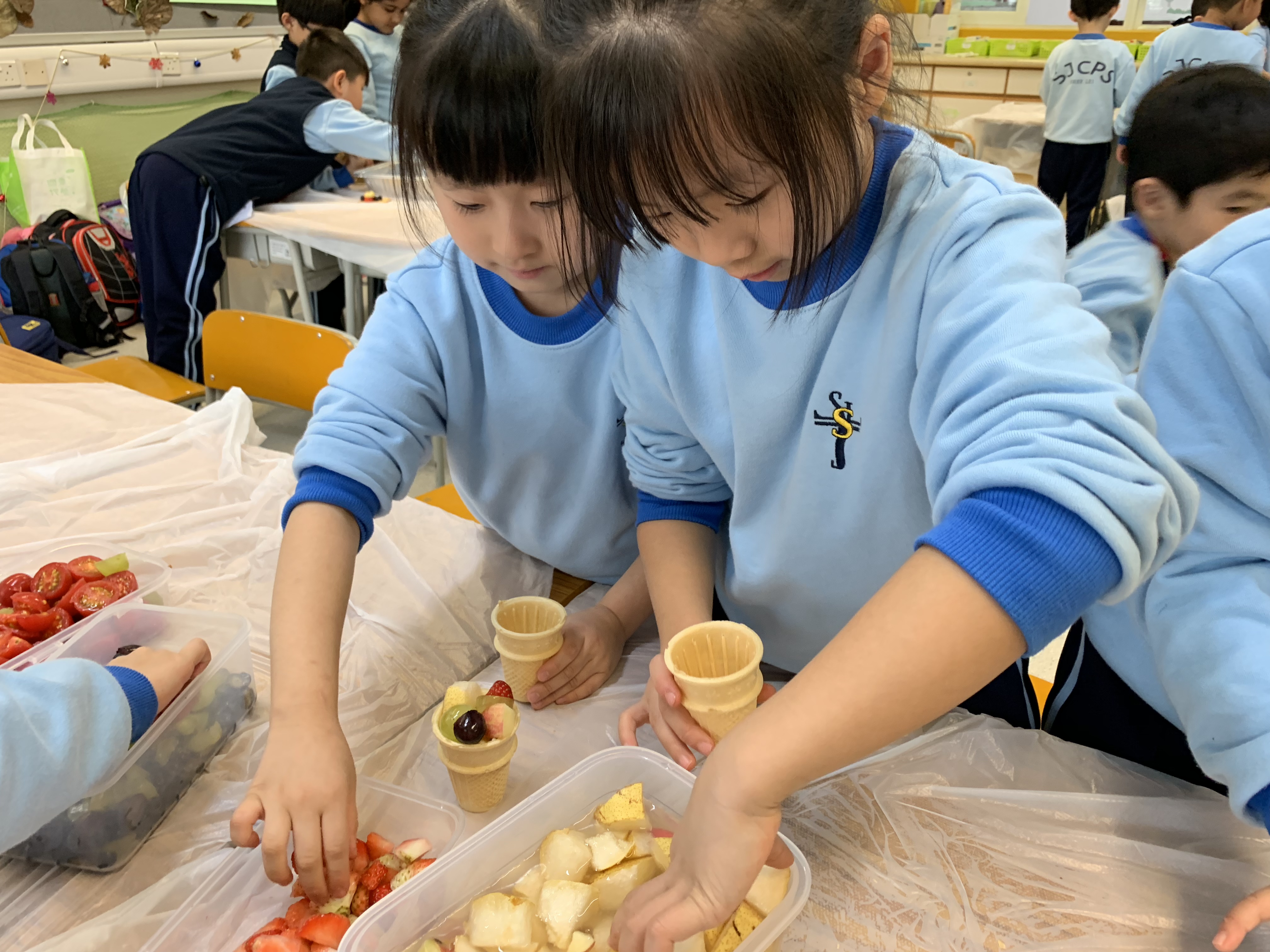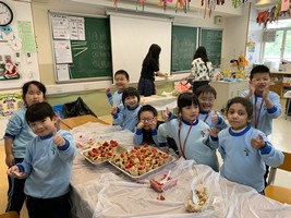 為感謝照顧他們的學校成員,小一學生帶備了水果,一起製作健康水果小食。很多小朋友都是第一次操刀,雖然開始時有點手忙腳亂,但通力合作之下終於完成精美的健康小食,送給多月來照顧大家的學校成員,一起分享努力的成果!