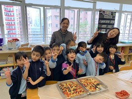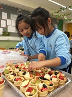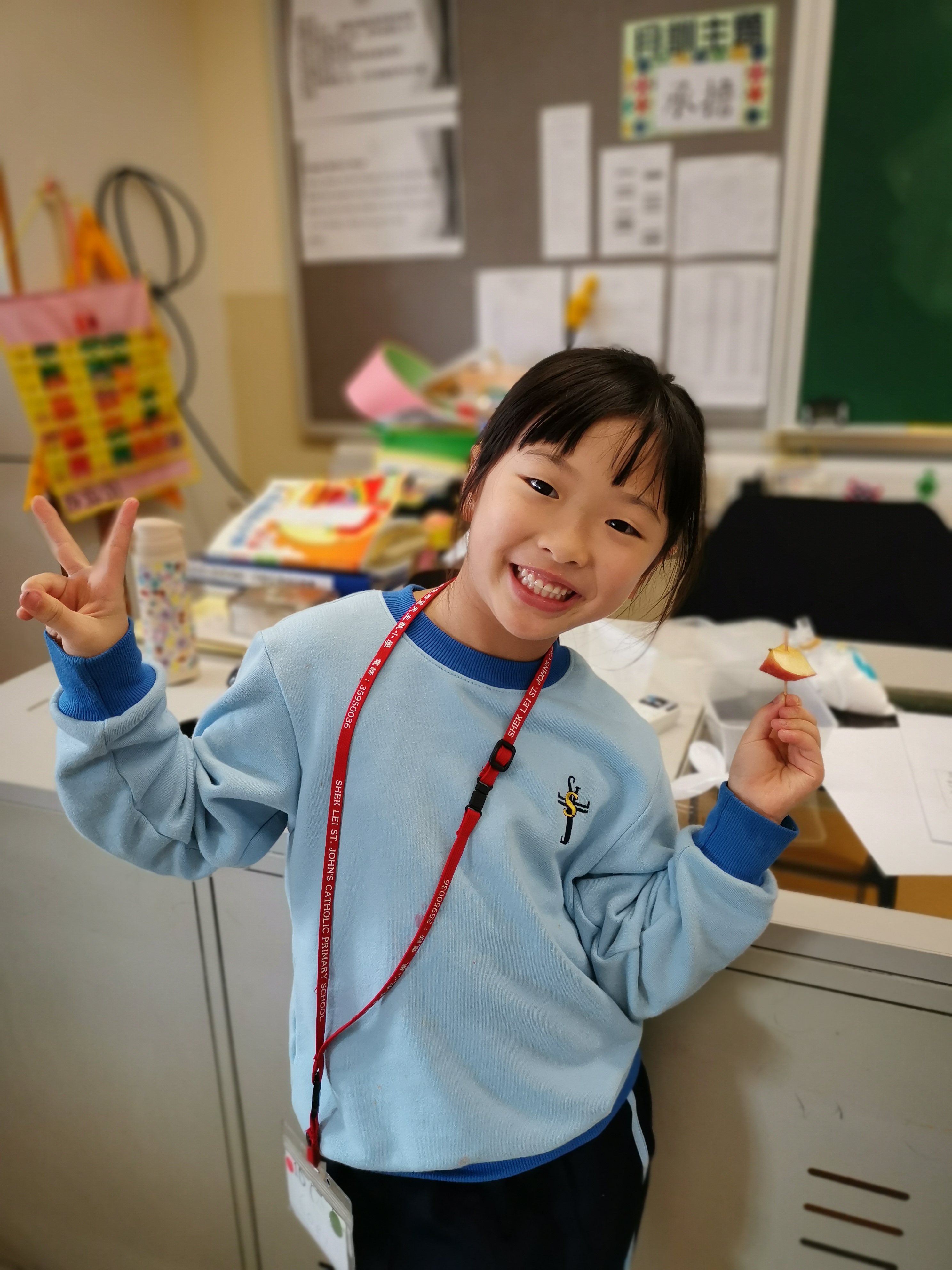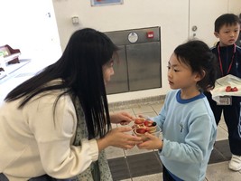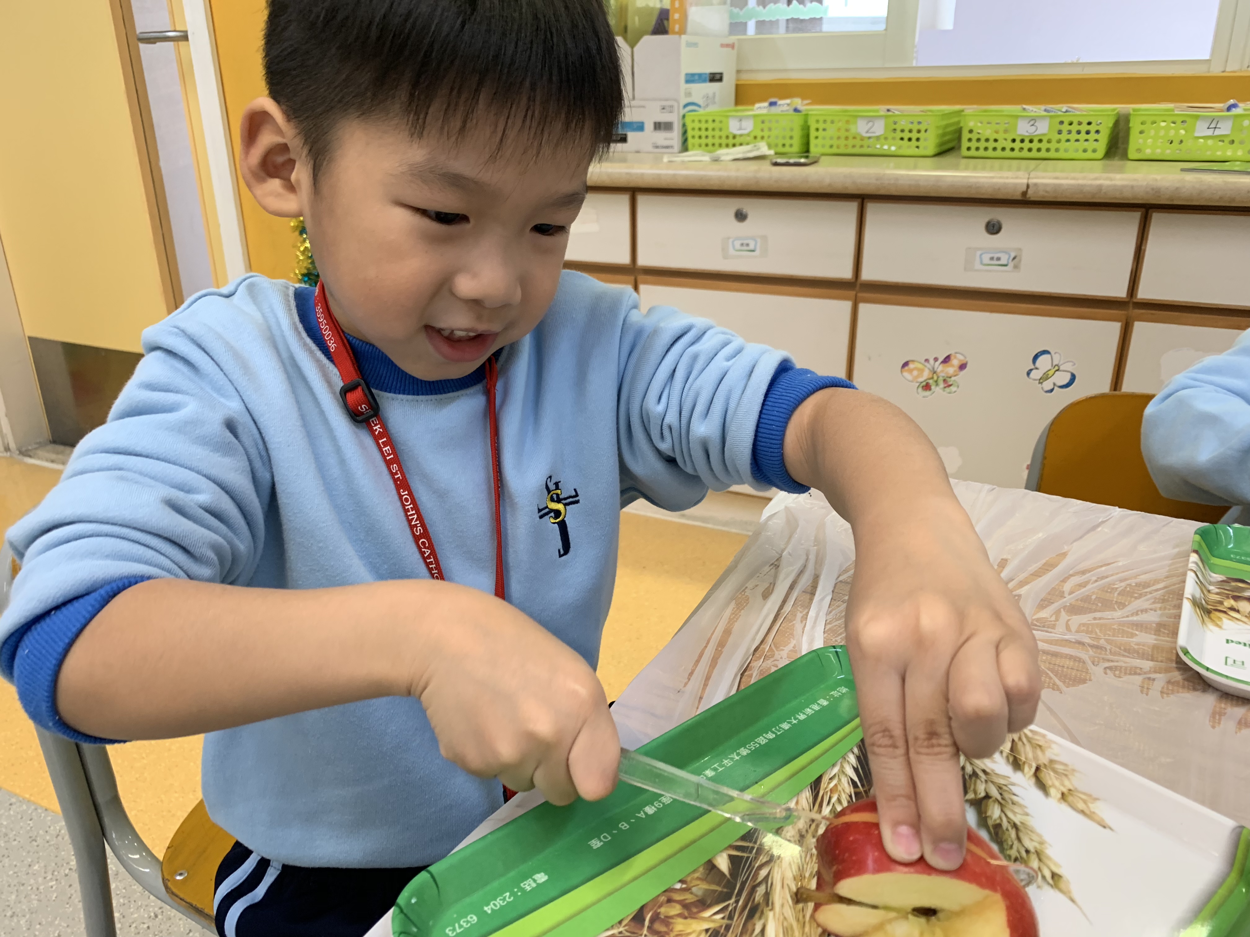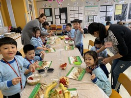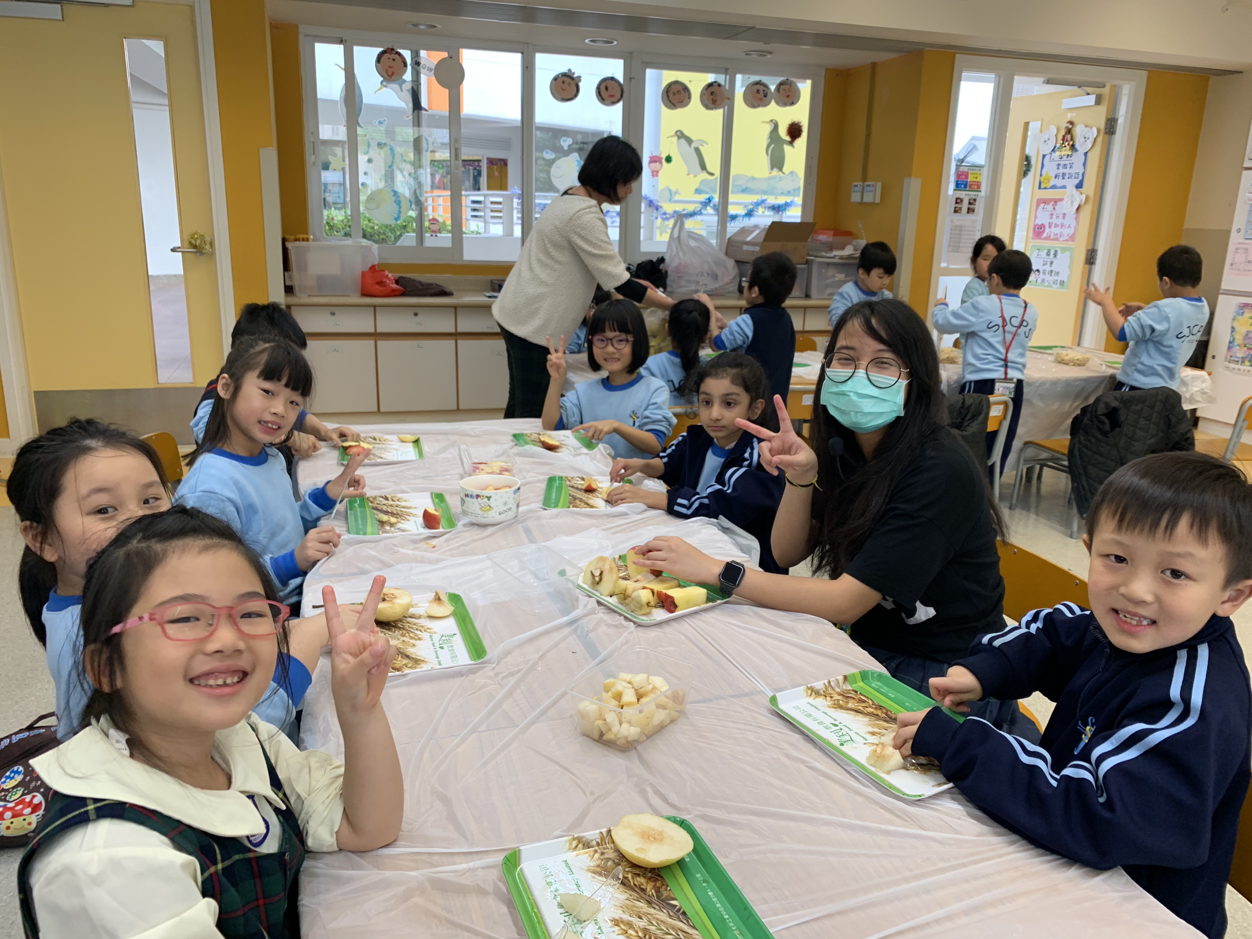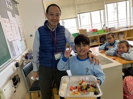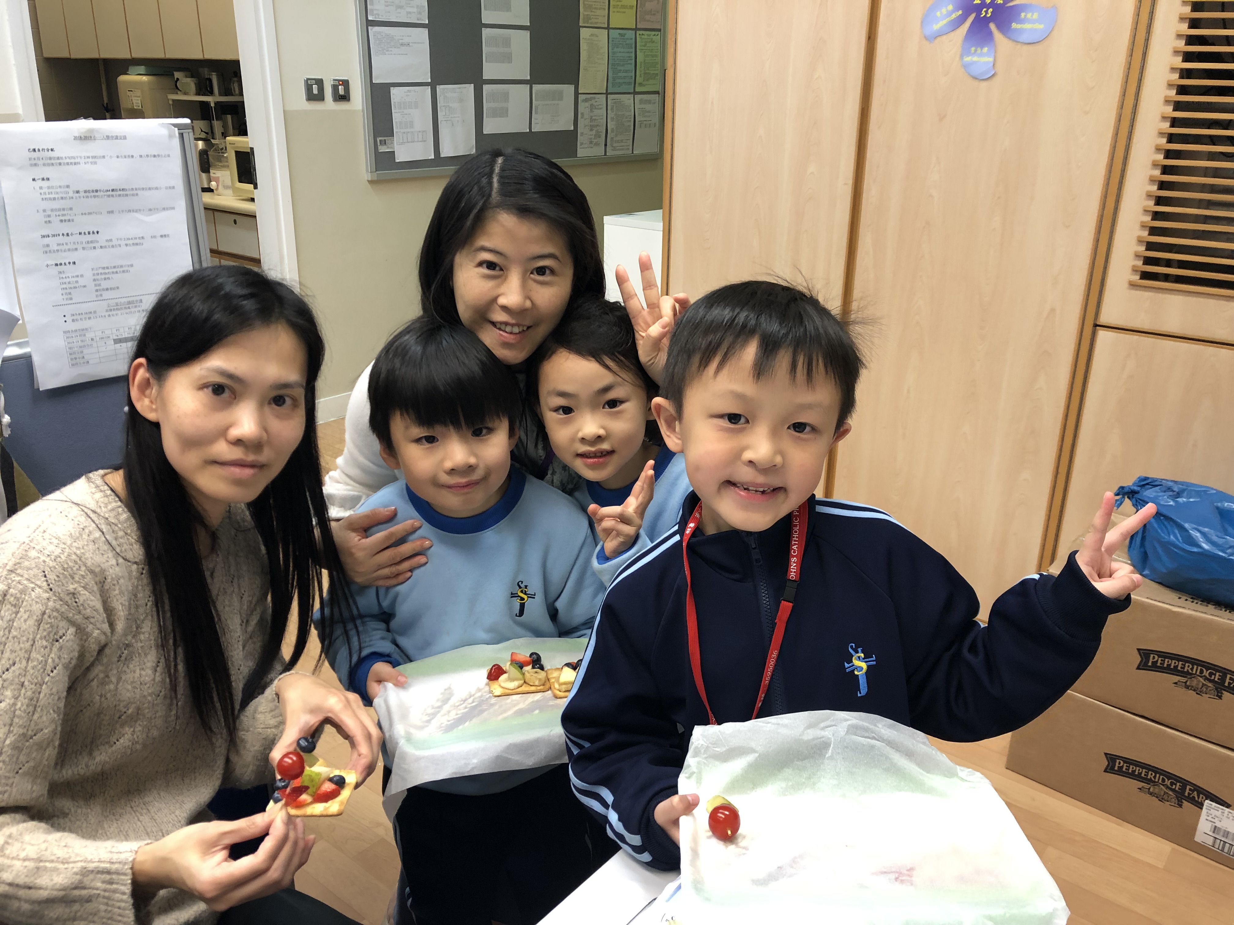 為感謝照顧他們的學校成員,小一學生帶備了水果,一起製作健康水果小食。很多小朋友都是第一次操刀,雖然開始時有點手忙腳亂,但通力合作之下終於完成精美的健康小食,送給多月來照顧大家的學校成員,一起分享努力的成果!