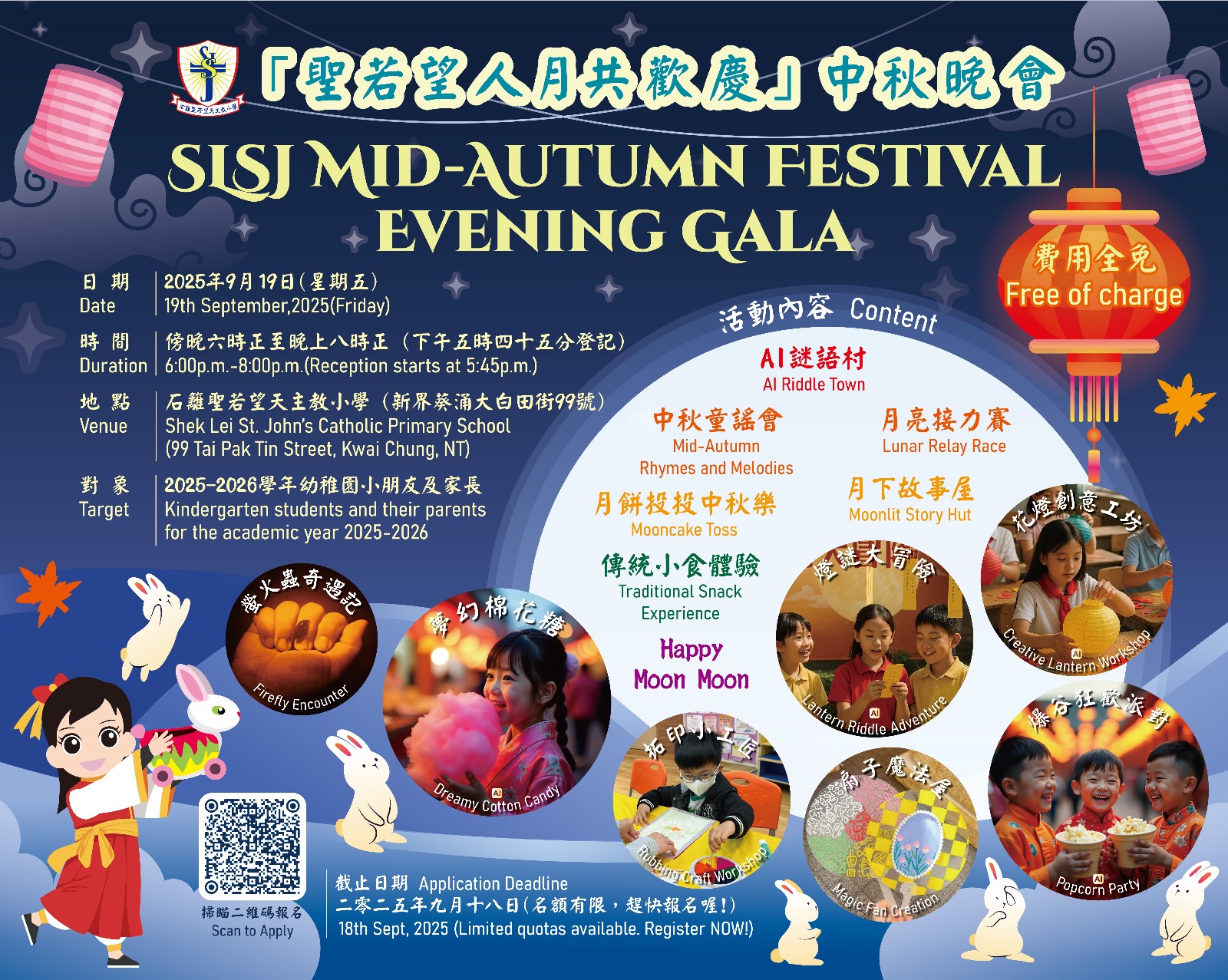 Shek Lei St. John’s Catholic Primary School 🏫 will hold a "Mid-Autumn Festival Evening Gala" on the evening of September 19th, inviting kindergarten K2 and K3 children and their parents for participation.