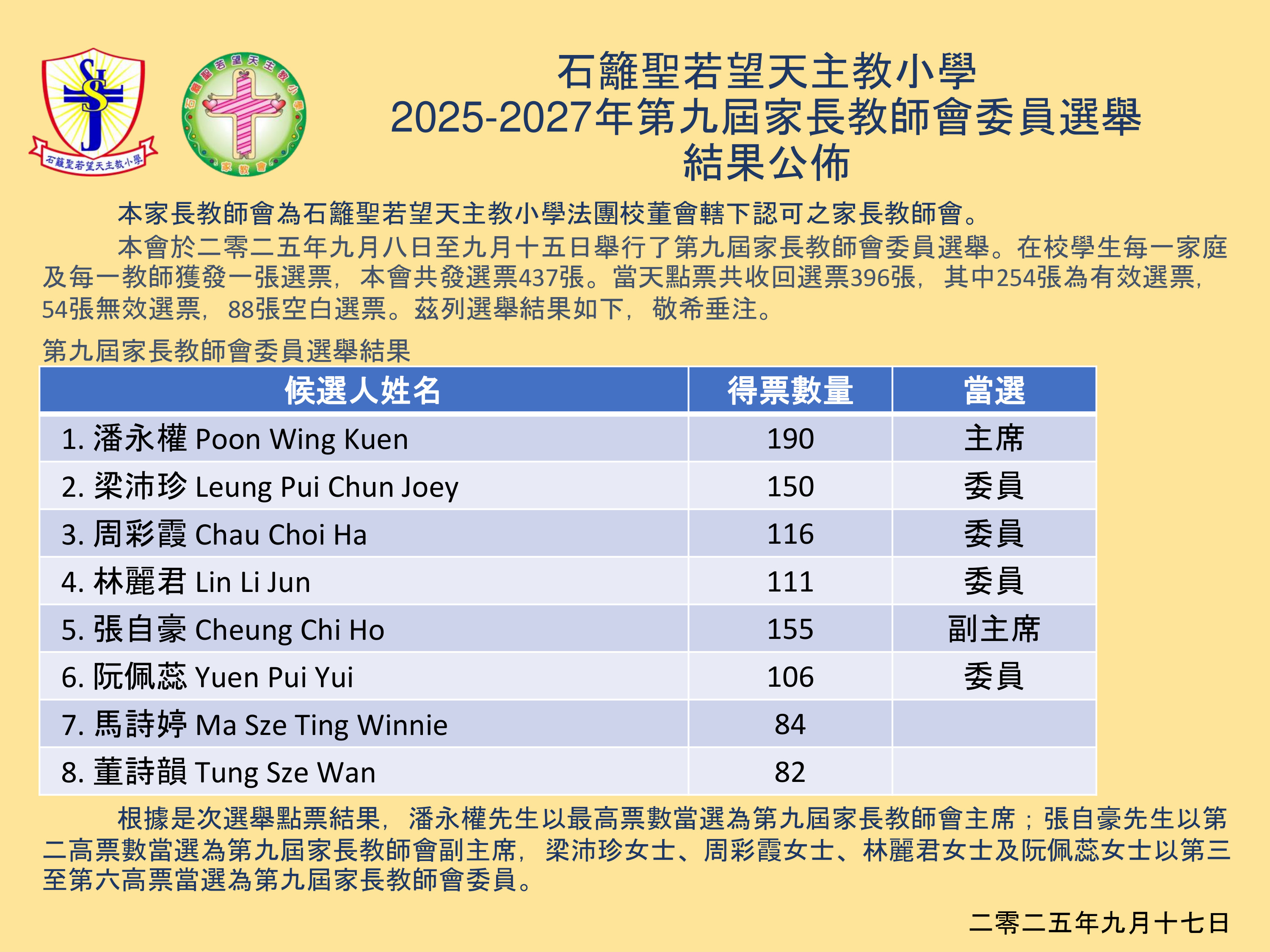2025-2027年第九屆家長教師會委員選舉結果公佈